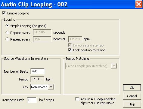 Затем, в открывшемся окне Audio Clip Looping ставите галочку Enable Looping. После этого на вашем файле, загруженном в окно мультитрек, появится слева внизу значок кольца, что значит - ваш файл имеет свойства цикла и теперь его можно, взявшись за правую нижнюю часть растянуть настолько, как вам это нужно.