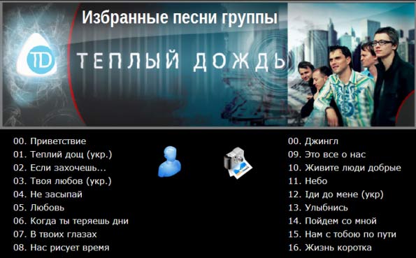 Группа "Теплый дождь" просуществовала более 6 лет. За это время было записано 4 альбома: "За тебя и меня", "Когда ты теряешь дни", "Исцеляя мое сомнение", "Это все о нас". Данный пост - презентация сборника избранных песен группы, из разных альбомов, всего 16 треков. Формат mp3. Сборник оформлен в авторан, создан для бесплатного распространения. Чтобы узнать, какие песни вошли в сборник, кликните на картинку и прочитайте. Скачать можно на этой странице |