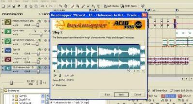 В первом диалоговом окне вам нужно выбрать переключатель Yes, что значит: "да, нужно пометить доли", и нажать кнопку Next. Программа начнёт делать метки, искать первую долю.  Затем в следующем окне - она создаст четырехдольный такт - петлю и, в общем, покажет вам, как звучит этот кусок вместе с метрономом. Некоторые нюансы можно подредактировать вручную, но в целом - уже будет понятно, какой темп у вашего файла. Кнопка финиш настроит проект Acid на новый темп.