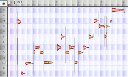 Поэтому есть смысл вначале загружать в проект трек с аккомпанементом (в нем обычно имеются явно заметные ритмические пульсации, облегчающие задачу программе) и только после этого подгружать трек с мелодией. В верхней части окна проекта находится раскрывающийся список, который принадлежит к числу существенных элементов графического интерфейса программы. Его наполнение зависит и от того, на каком этапе редактирования мелодии находится программа, и от того, какой инструмент редактирования выбран вами. С помощью команд раскрывающегося списка можно выполнить актуальное в данный момент действие. В большинстве случаев одной из его команд является команда возврата к исходному состоянию редактируемого материала. Первым этапом редактирования мелодии является ее автоматическое распознавание (в терминологии программы - детектирование). Поэтому в раскрывающемся списке выберите команду Detect Melody. Откроется диалоговое окно Sound Files. В нем следует назначить алгоритм распознавания, наиболее эффективный для музыкального материала определенного типа. Варианты перечислены в раскрывающемся списке Parameter Set. Например, если редактируемую мелодию спел тенор, то с помощью системы меню вы должны выбрать алгоритм распознавания, который и называется Tenor Vocals. Среди вариантов алгоритмов распознавания имеются "заточенные" для разговорной речи, ударных инструментов, мелодии, спетой голосами различных типов и сыгранной на различных струнных и духовых инструментах. Выбрав алгоритм, нажмите кнопку Detect. Начнется процесс распознавания мелодии. О его ходе будет сигнализировать прогресс-индикатор. Как только этап распознавания завершится, сигналограмма в окне проекта изменит свой вид. Теперь на треке отображается не только сам факт существования в пределах тех или иных временных интервалов звуковых колебаний с определенной амплитудой, но и индицируется изменение высоты тона (рис. 2).